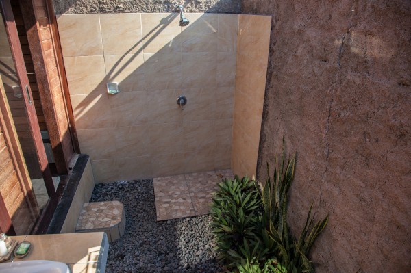 Salle de bain complète, extérieure. Lorsque l’appel de la nature se présente… Les galets sont semi confortable pour les pieds nus.