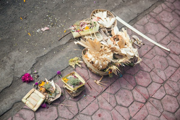 Ce sont de petits paniers en feuilles de palmiers qui contiennent des fleurs, des biscuits, des grains de riz, des cigarettes, de l’encens, des mentos. Les petits paniers sont des fois fabriqués par les familles, sinon achetés sur la rue. C’est un rituel religieux important principalement effectué par les femmes. On retrouve ça partout partout partout sur Bali.