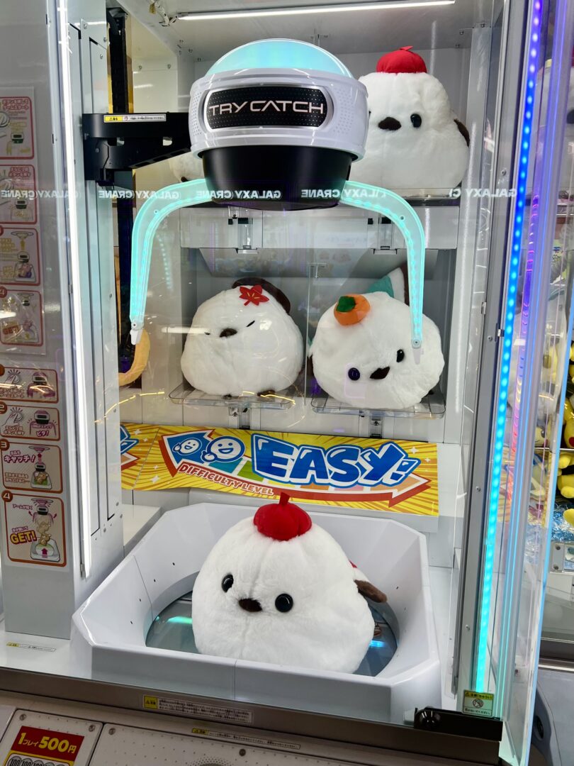 On aurait probablement dû prendre celle-ci, où c’est plus cher mais où tes chances sont en théorie plus grandes vu que t’as juste un gros toutou et la pince est au-dessus. Nos 2 tentatives sur la machine régulière ont été des échecs.