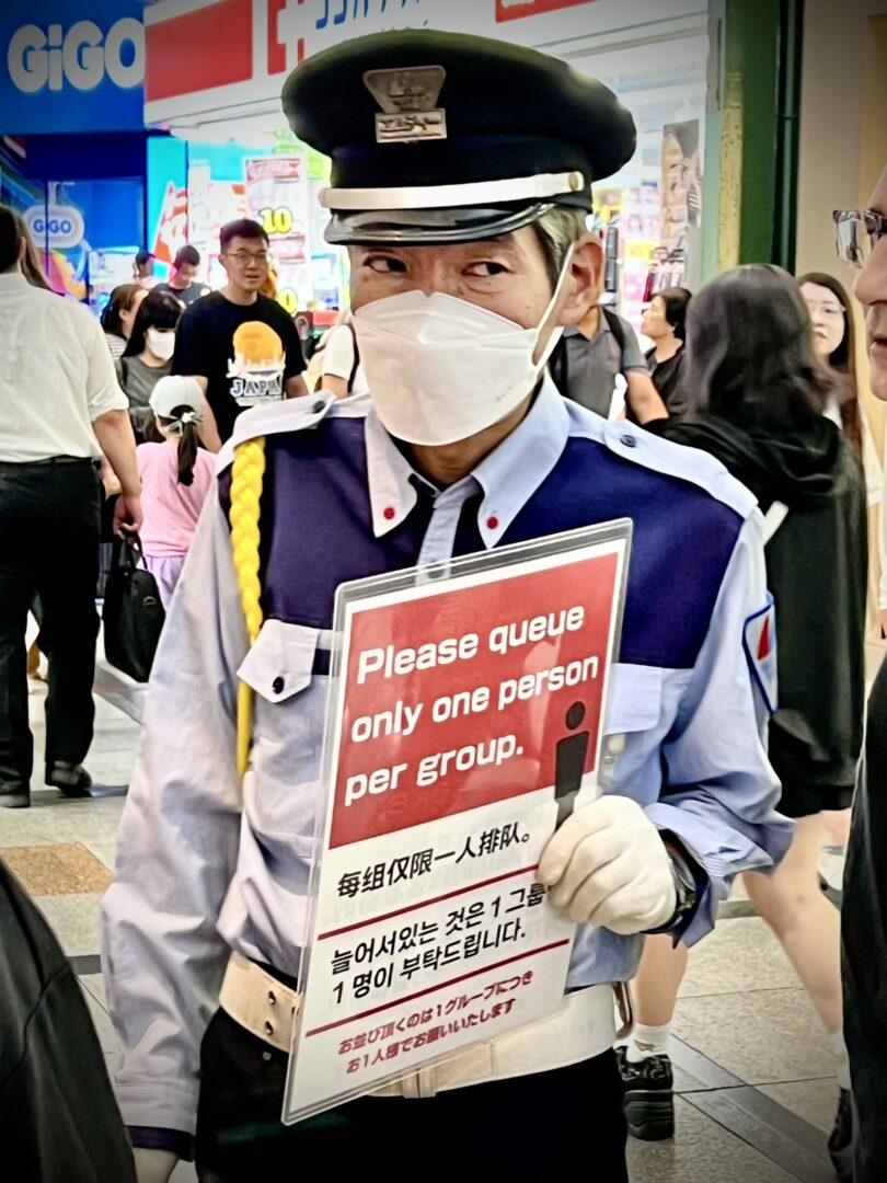 Il y a beaucoup de japonais qui ont des jobs de signalisation et qui prennent ça vraiment à coeur (et c’est le fun). Avec sa pancarte, il nous suggère qu’il ne veut pas que ça s’en-bordelise et que c’est mieux si on est juste 1 par famille dans la file.