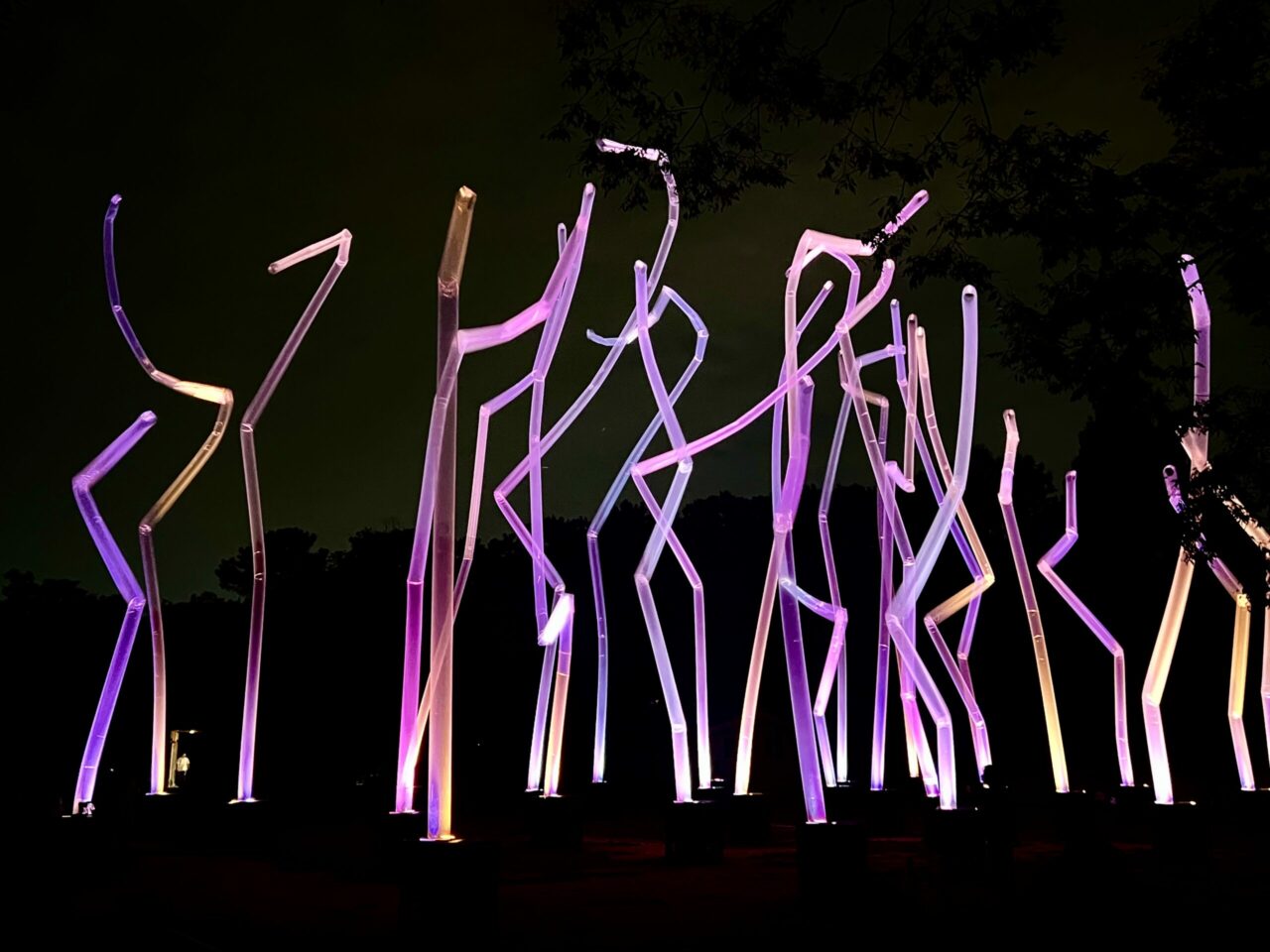 Ça c’était des gros tubes avec des gros ventilateurs qui soufflaient fort pour les faire monter + de l’éclairage. C’était cool, mais le son était assez fort et (ça c’est moi qui est sensible aux bruits en général) je trouvais que ça brisait un peu l’harmonie sonore relaxante du reste. Mais bon. L’oeuvre ne peut pas exister sans les ventilateurs, alors c’est la vie. Les tubes montaient à peut-être… 10m de haut, ou un peu plus? C’était comme les bonhommes rouges qui t’invitent à aller au lave-auto avec leur corps qui bouge un peu tout croche.