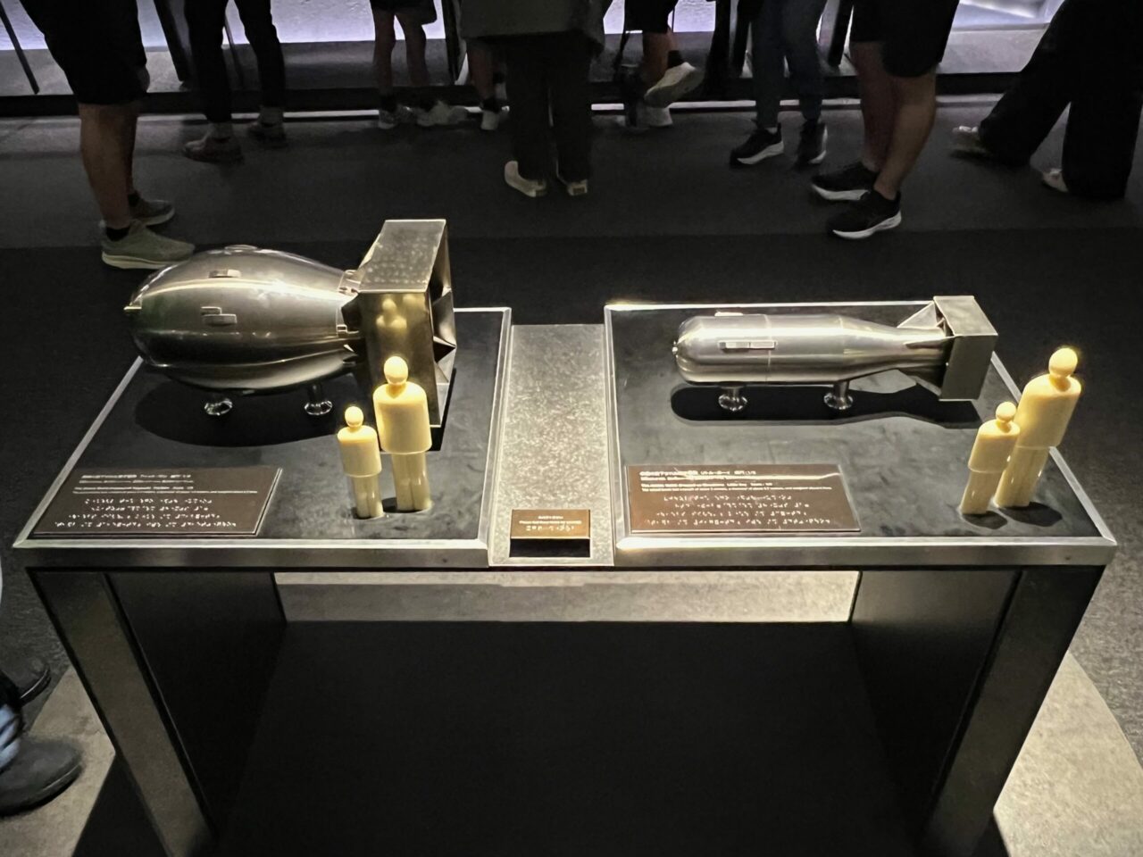 Ici on voit la taille de Little Boy (Hiroshima) vs. Fan Man (Nagasaki) et la taille des humains.