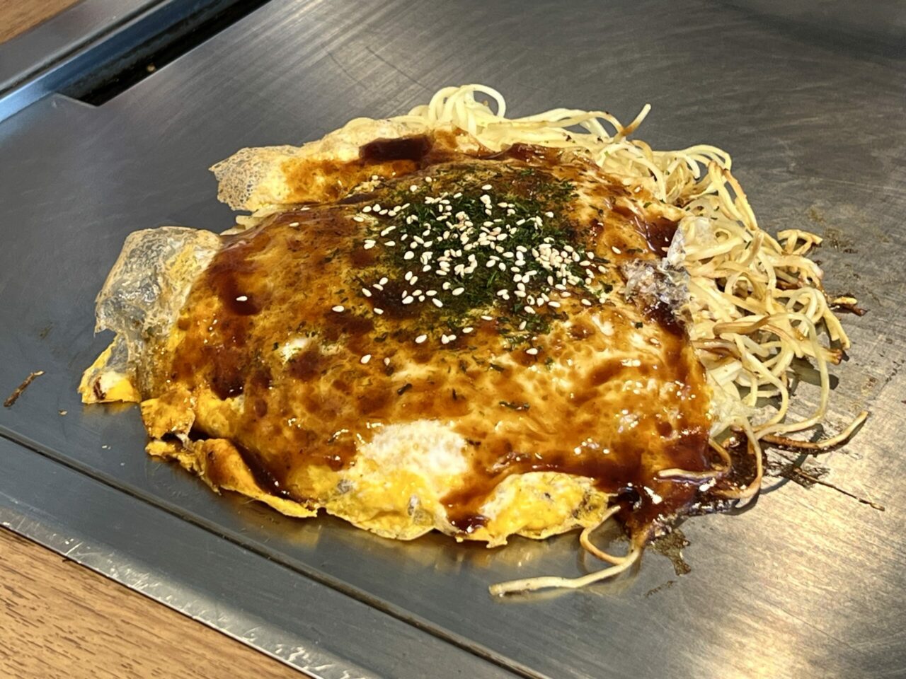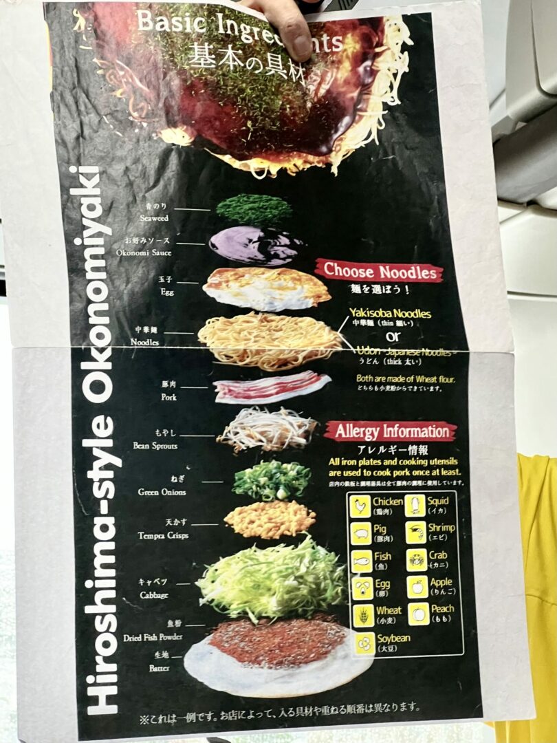 Les okonomiyakis (ce qu’on a cuisiné chez l’habitant, voir le jour 9), sont faits différemment ici, en couches au lieu de mélanger les ingrédients. Chaque région dit que sa recette est la meilleure, bien sûr.